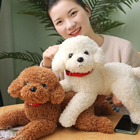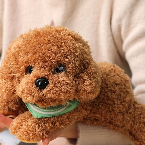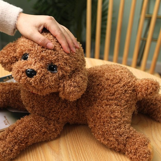 ふわふわの巻き毛が愛らしいトイプードル ぬいぐるみです。 リラックスした寝そべりポーズが特徴で、つぶらな瞳と黒い鼻が本物のような可愛らしさを演出しています。 柔らかな手触りで抱き心地抜群、お子様から大人まで癒されること間違いなしの犬 ぬいぐるみです。 インテリアとしてお部屋に飾ったり、抱き枕としても最適で、毎日の生活に癒しと温もりをもたらしてくれます。