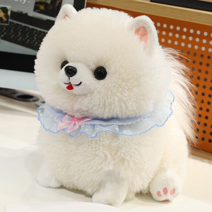 ふわふわの毛並みと可愛らしいレース襟が特徴で、首元のリボン刺繍がアクセントになっています。